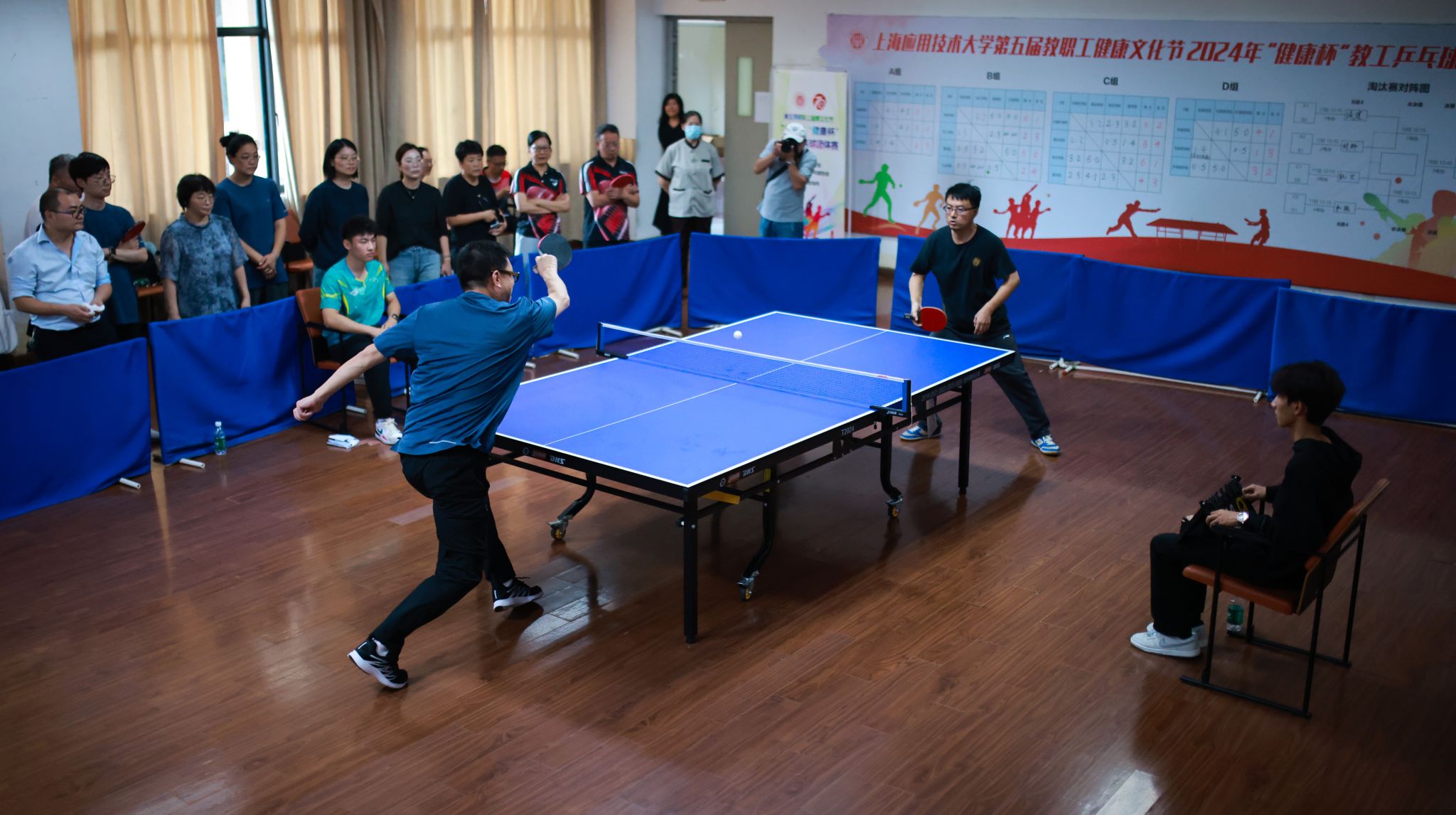 “健康杯”教工乒乓球团体赛是我校工会举办的品牌文体活动,自2014年至今已连续举办了五届。本项赛事为学校教职工们提供了展示球技、交流感情的平台,展现了上应教职工们积极向上的精神风貌和团结协作的团队精神,同时也增强了教职工之间的凝聚力和向心力,推动了校园健康文化的繁荣发展。