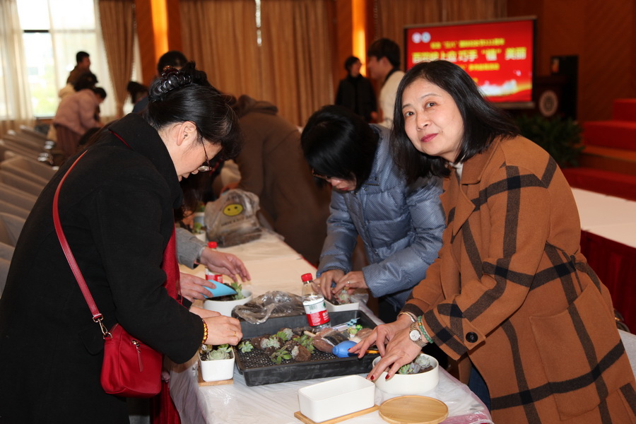 第二场活动是“百花绽上应 巧手‘植’美丽” 女教职工多肉盆栽活动,近百名女教师参加。首先,学生志愿者通过PPT讲解和现场演示,介绍了多肉植物的品种特性、种植方式、日常护理、盆栽景观搭配等方面的知识。随后,女教师们自己动手进行栽种多肉植物,通过填土、配色、种植等步骤,形成了一个个漂亮的多肉盆栽景观。女教师们的作品精彩纷呈,体现了女教师们的心灵手巧和雅致美学,同时很多作品包含了庆祝建党百年的元素,体现了女教师们浓浓的爱党爱国情怀。