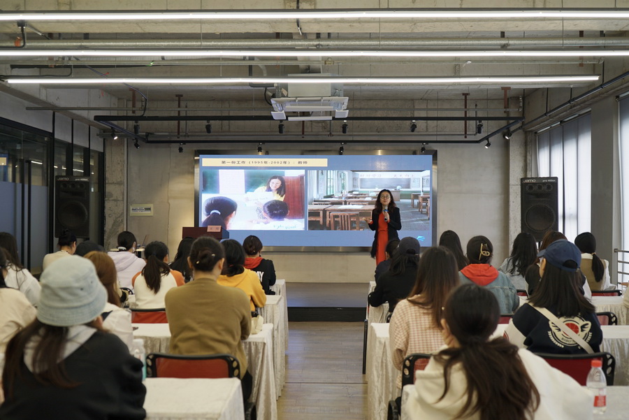 海阔·东岸文创园是金山首个民营市级示范园区,是一个兼具艺术、文化创意、科技、旅游等复合功能的体验式园区,并为青年创新创业提供孵化平台。王芳亲自领带小海鸥们进行参观,介绍了文创园的功能设计和特色艺术展品。园区内浓厚的艺术文化氛围、徽派木雕建筑、非遗手工坊、特色咖啡书店等都深深吸引了小海鸥们。随后,王芳和小海鸥们讲述了自己的创业历程,分享了她寻求职业生涯最优解的经历,实现了从教师到银行职员再到女企业家的角色转变。她勤于学习、勇于挑战、乐于思考,坚持做精做特,将咖啡馆、民宿等产业“折腾”得越来越有文化特色和文化品位。同时她秉持干事创业的魄力,积极承担社会责任,乐于奉献,坚持做正确而有价值的事,给小海鸥们传递了满满正能量!