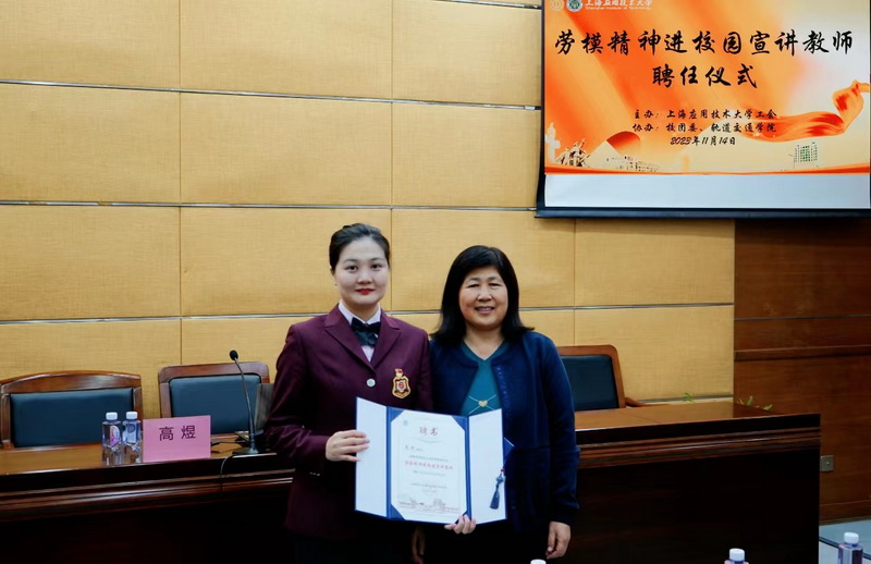 11月14日晚,在深入学习贯彻党的二十大精神之际,为进一步发挥劳模先进榜样示范引领作用,大力弘扬劳模精神、劳动精神,让劳动精神、劳模精神成为师生成长成才的精神动力,由学校工会主办,校团委和轨道交通学院协办,学校举行劳模精神进校园主题宣讲活动,主题活动特邀党的二十大代表、上海市劳模高煜为全校学生做主题宣讲。校工会常务副主席张淑梅为高煜老师颁发劳模精神进校园宣讲教师聘书。