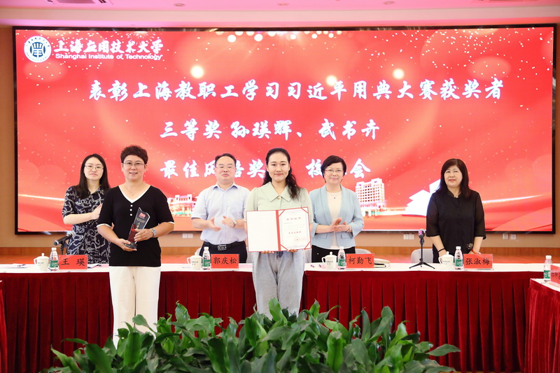 会上对获工会系统各级、各类荣誉的先进集体及个人进行了表彰,校党史知识竞赛决赛各代表队、上海教职工学习习近平用典大赛三等奖获得者、上海市2020年教职工书法及板书大赛获奖者、上海市第33届优秀发明选拔赛获奖者、校2019-2020年度“三八红旗手”、校2019-2020年度优秀教工小家等先进集体和个人上台领奖。